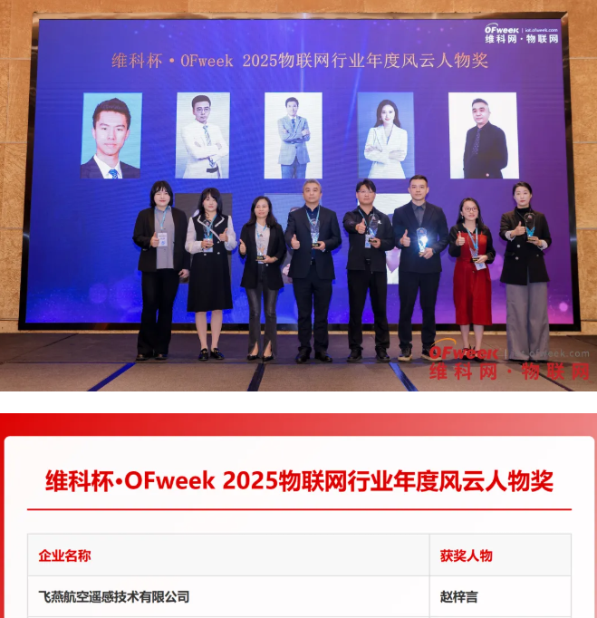 本次評選面向科研院所、高校及企業相關單位,通過層層嚴苛考評與審核,旨在遴選物聯網行業內公認的知名人士,以及帶領企業實現重大業績突破、技術創新與應用開拓,創造顯著社會價值的企事業單位核心人物。最終,胡潤獨角獸企業特斯聯科技集團有限公司創始人艾渝、上市公司深圳市力合微電子股份有限公司總經理劉鯤、上海交通大學智能裝備研究院的任飛教授等一眾行業標桿人物聯袂上榜,飛燕航空遙感技術有限公司(以下簡稱“飛燕遙感”)總經理趙梓言憑借在物聯網與測繪地理信息領域的卓越建樹,與上述行業翹楚同獲 “2025 物聯網行業年度風云人物” 稱號,這份榮譽既是對其個人專業能力與戰略眼光的高度認可,更彰顯了飛燕遙感在行業內的硬核實力與領先地位。